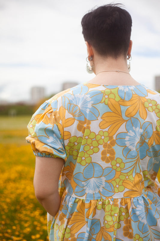 Robe courte à fleurs bleues, oranges et vertes