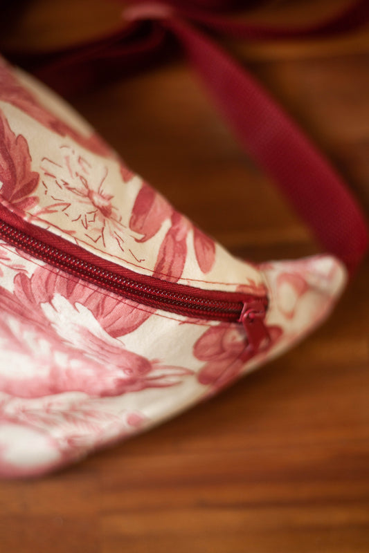 Sacoche banane motifs oiseaux et fruits bordeaux